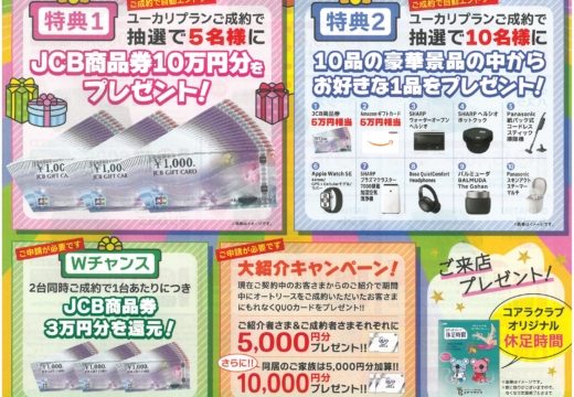 株式会社 ルマンオートでは、コアラクラブ新車リース「ユーカリプラン」の春のわくわくプレゼントキャンペーンを開催中です(3月1日〜4月30日)。 期間…