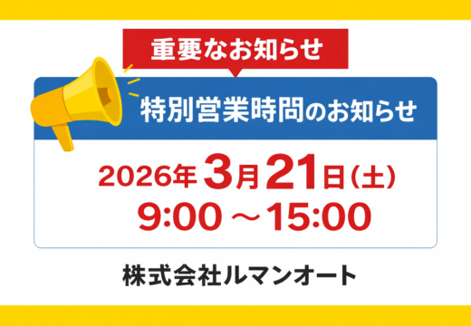 平素より株式会社ルマンオートをご利用いただき、誠にありがとうございます。 誠に勝手ながら、下記の通り特別営業時間とさせていただきます。 ■特別営業時…